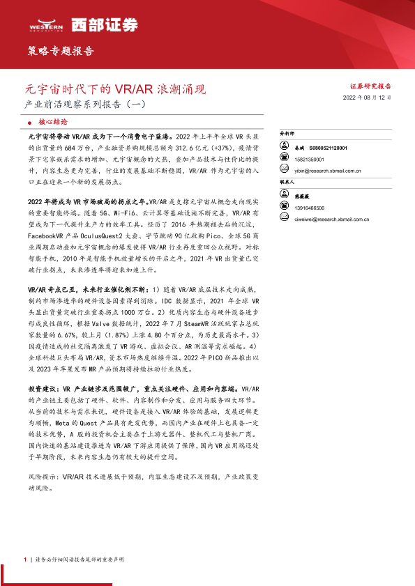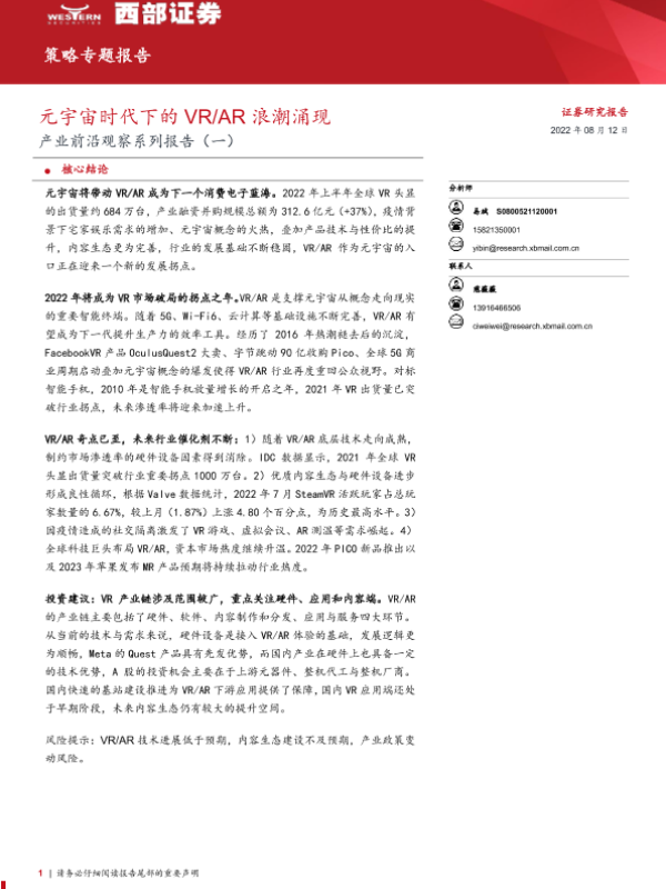 【西部证券】【20220812】产业前沿观察系列报告(一):元宇宙时代下的VRAR浪潮涌现-23页