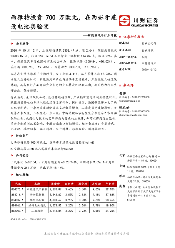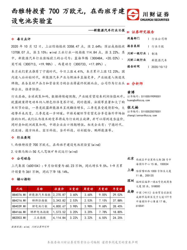 【川财证券】【20201012】新能源汽车行业日报:西雅特投资700万欧元,在西班牙建设电池实验室-3页