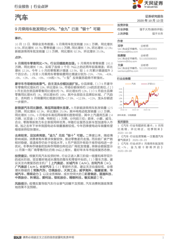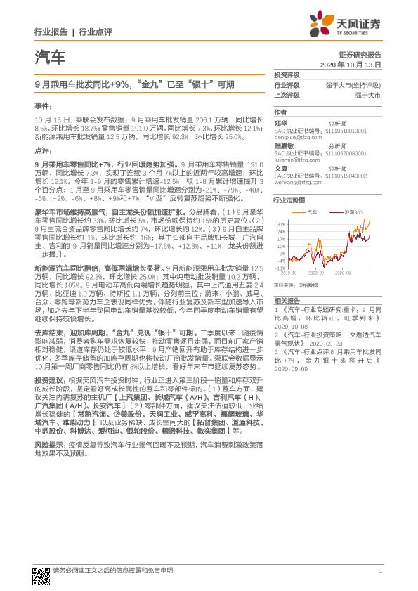 【天风证券】【20201013】20201013-天风证券-汽车行业点评:9月乘用车批发同比+9%,“金九”已至“银十”可期-11页