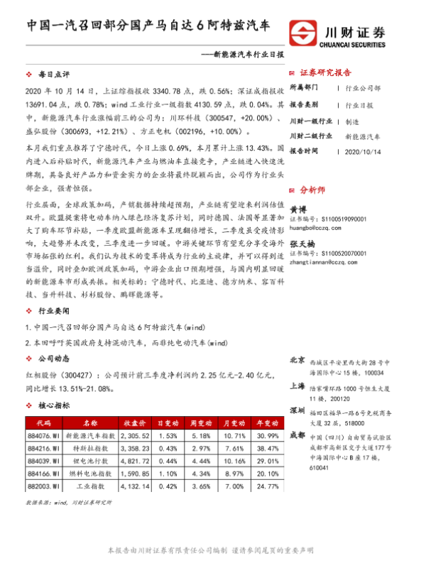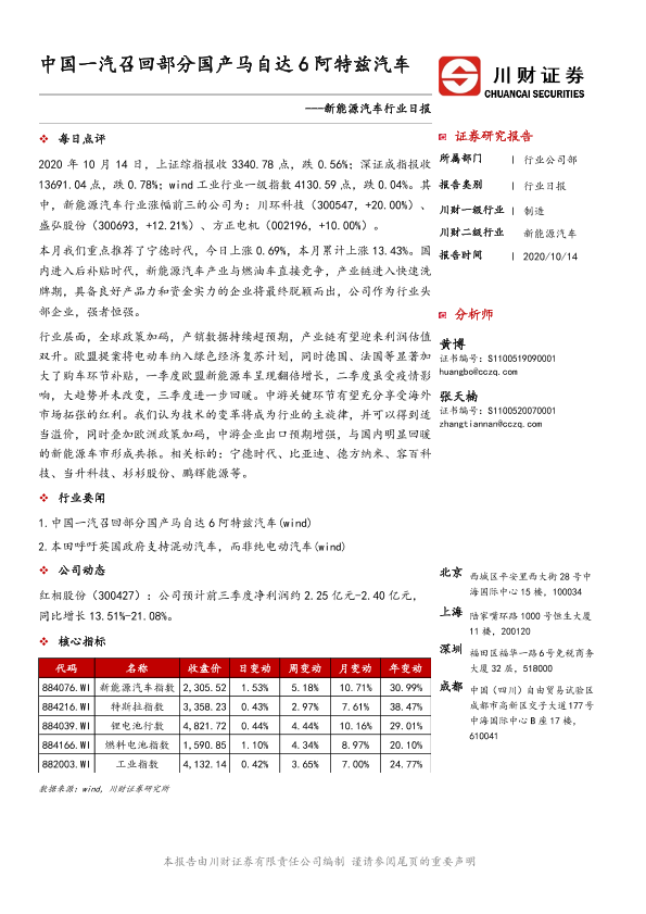 【川财证券】【20201014】新能源汽车行业日报:中国一汽召回部分国产马自达6阿特兹汽车-3页
