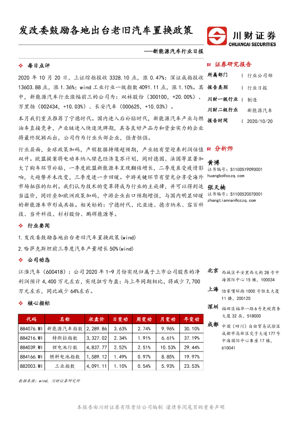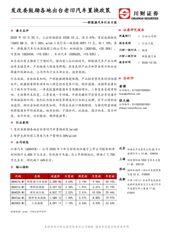 【川财证券】【20201020】新能源汽车行业日报:发改委鼓励各地出台老旧汽车置换政策-3页