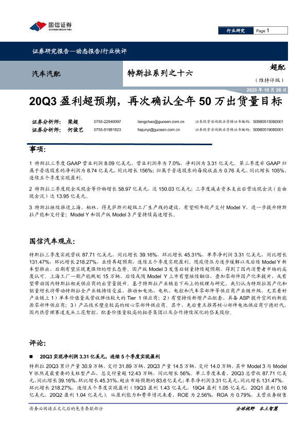 【国信证券】【20201026】20Q3盈利超预期,再次确认全年50万出货量目标-7页