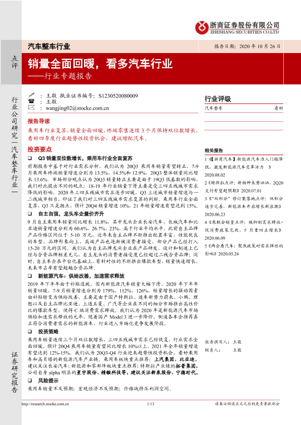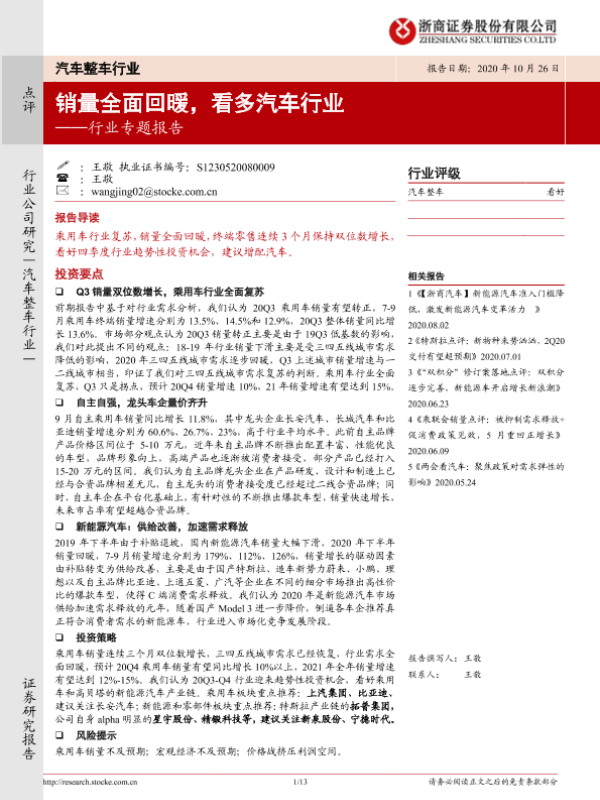 【浙商证券】【20201026】汽车整车行业专题报告:销量全面回暖,看多汽车行业-13页