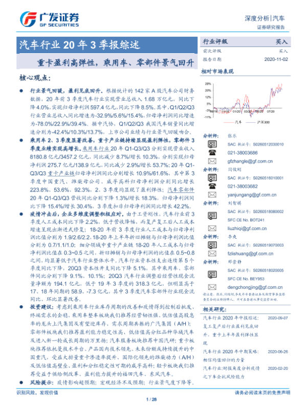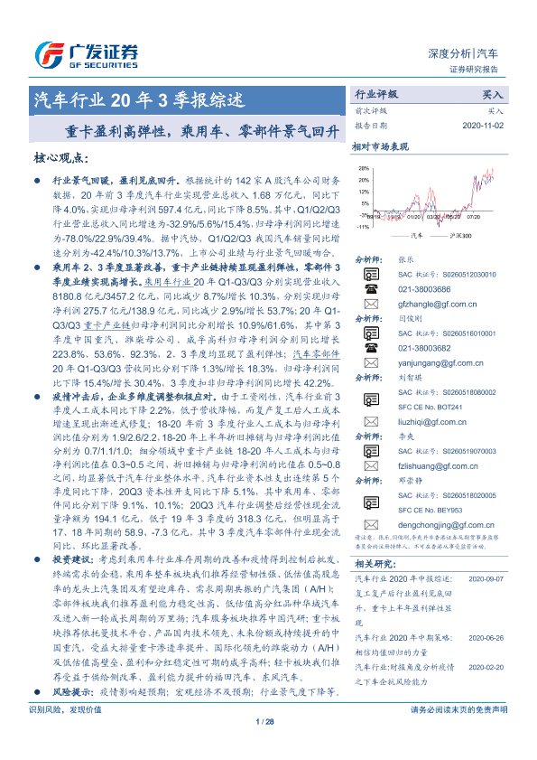 【广发证券】【20201102】汽车行业20年3季报综述:重卡盈利高弹性,乘用车、零部件景气回升-28页
