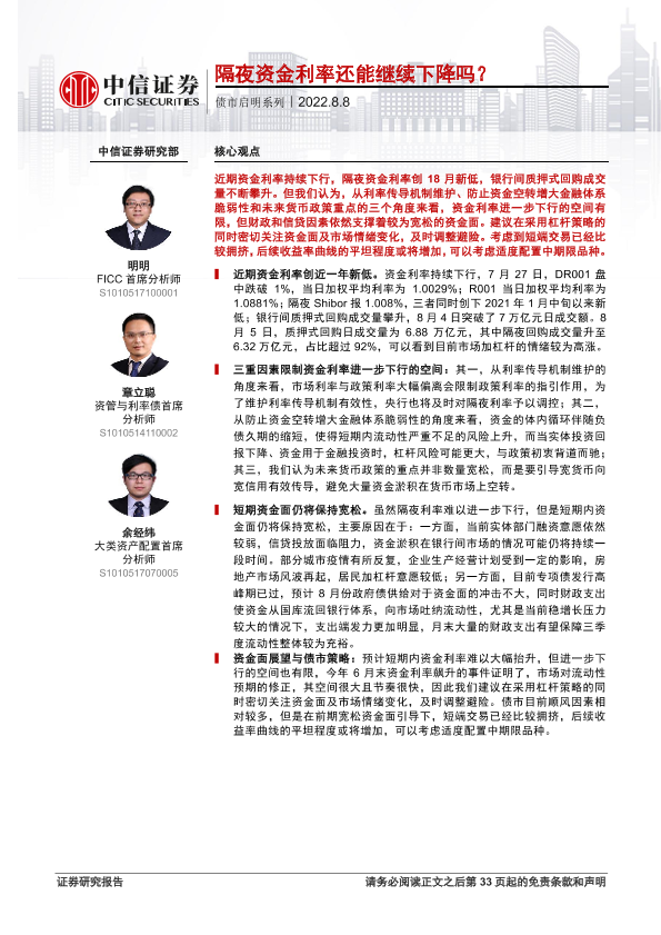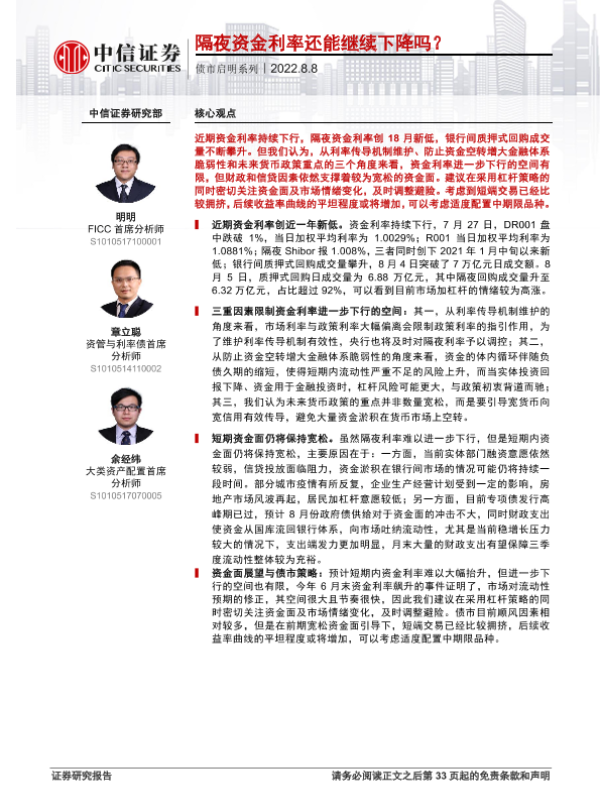 【中信证券】【20220808】债市启明系列:隔夜资金利率还能继续下降吗?-34页