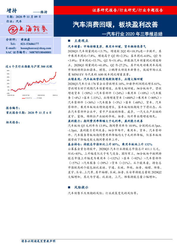 【上海证券】【20201109】汽车行业2020年三季报总结:汽车消费回暖,板块盈利改善-16页