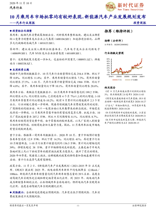 【新时代证券】【20201110】20201110-新时代证券-汽车行业周报:10月乘用车市场批零均有较好表现,新能源汽车产业发展规划发布-19页