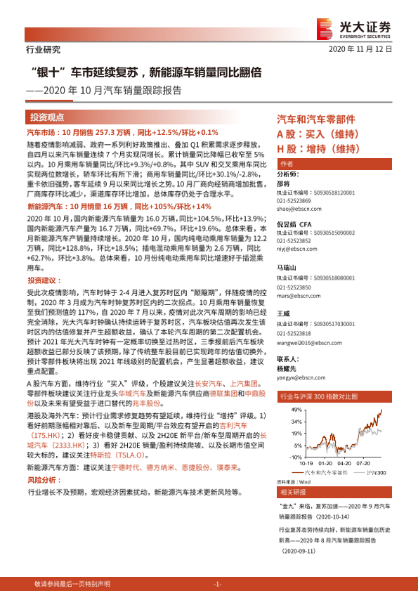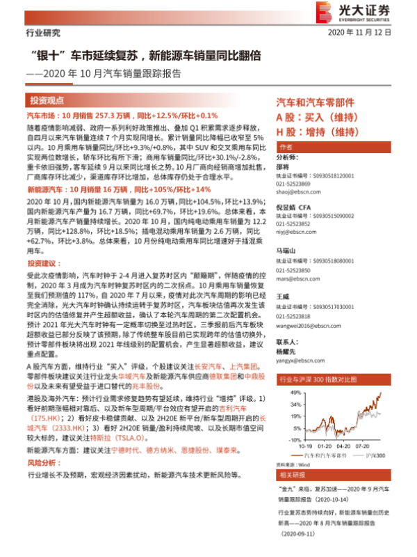 【光大证券】【20201112】2020年10月汽车销量跟踪报告:“银十”车市延续复苏,新能源车销量同比翻倍-13页