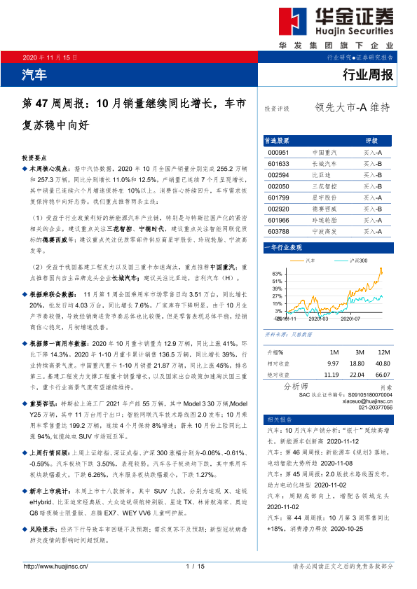 【华金证券】【20201115】汽车第47周周报:10月销量继续同比增长,车市复苏稳中向好-15页