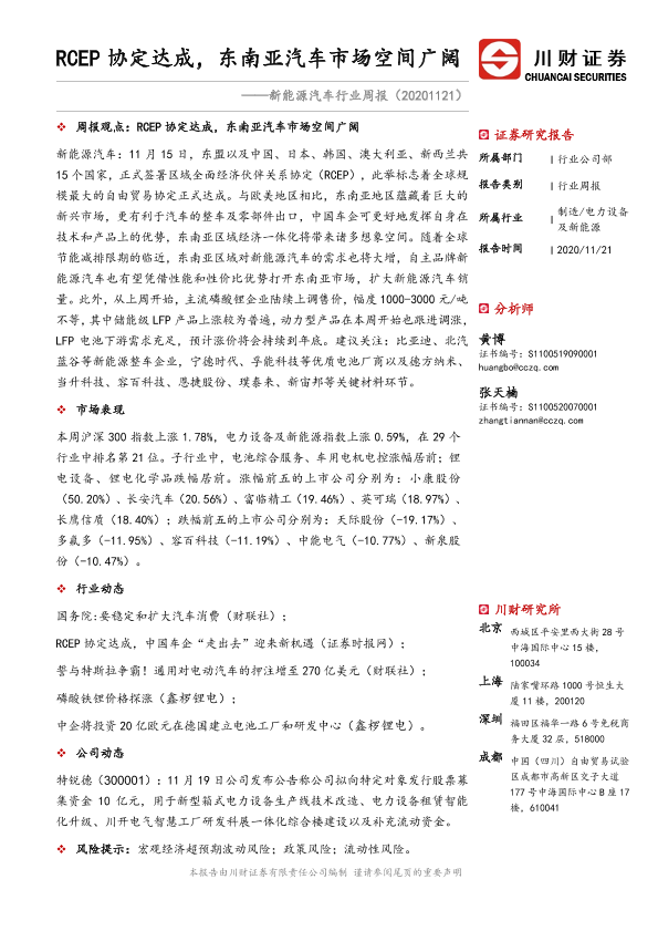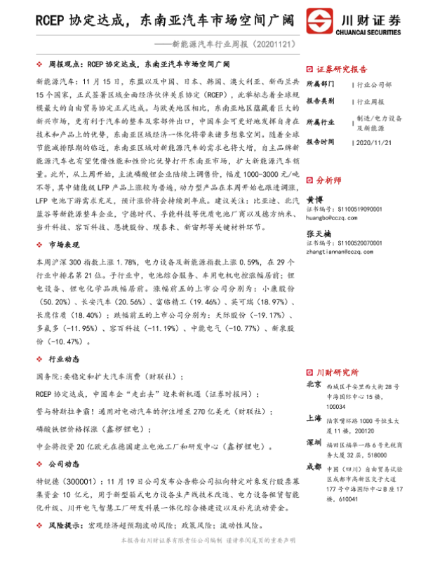 【川财证券】【20201121】20201121-川财证券-新能源汽车行业周报:RCEP协定达成,东南亚汽车市场空间广阔-16页