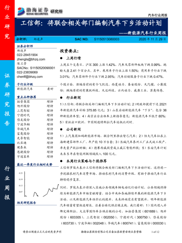 【渤海证券】【20201129】新能源汽车行业周报:工信部:将联合相关部门编制汽车下乡活动计划-12页