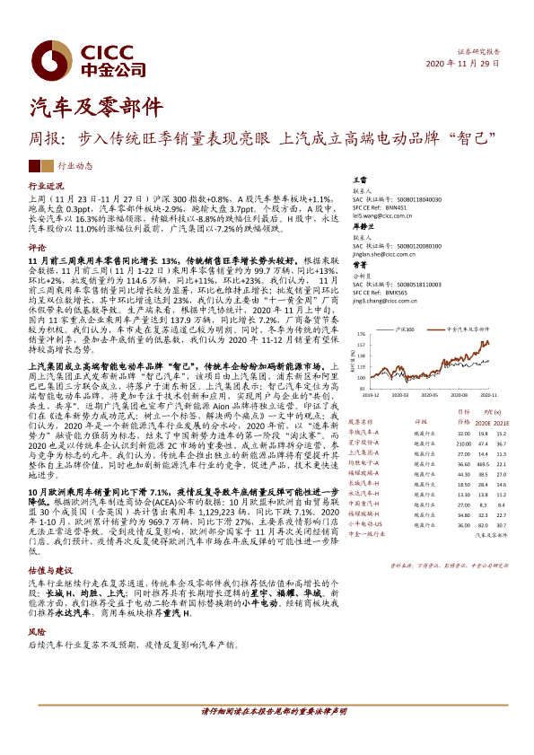 【中金公司】【20201129】汽车及零部件周报:步入传统旺季销量表现亮眼 上汽成立高端电动品牌“智己”-12页