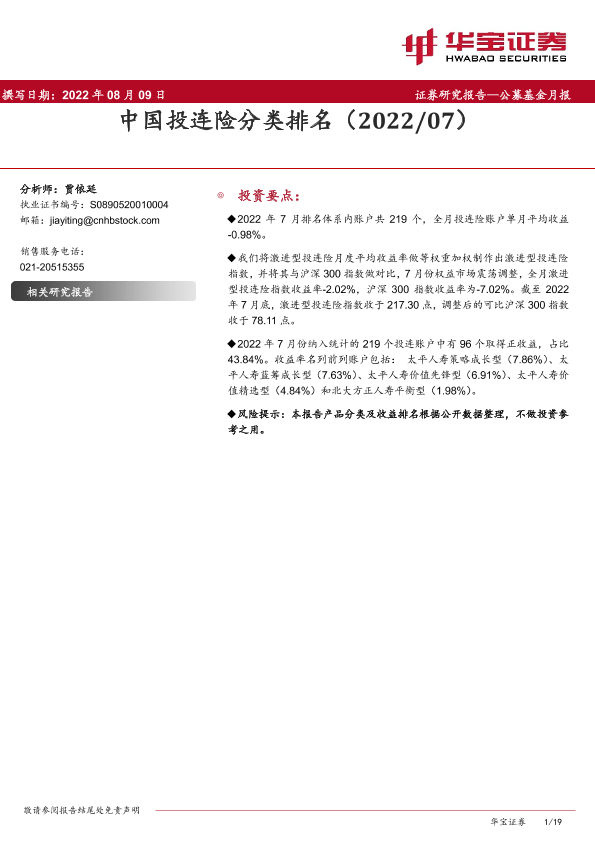 【华宝证券】【20220809】公募基金月报:中国投连险分类排名-19页