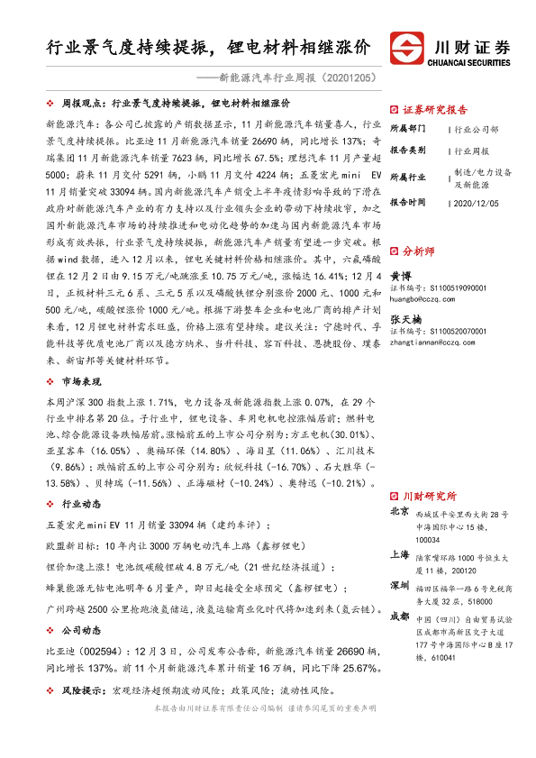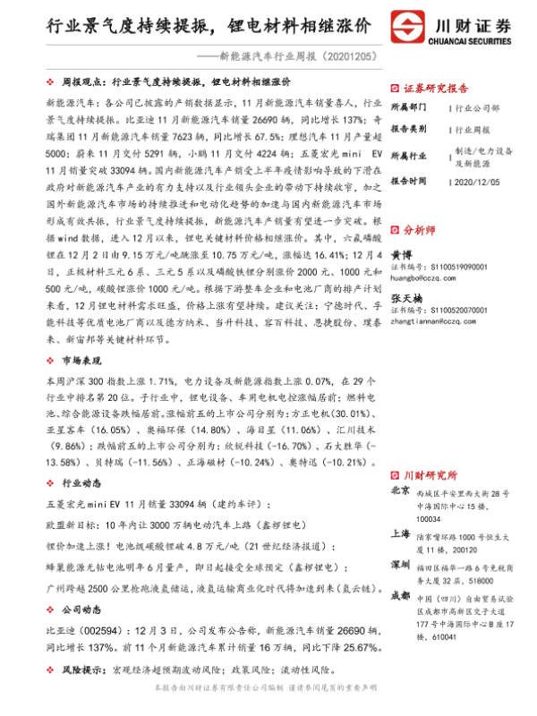 【川财证券】【20201205】20201205-川财证券-新能源汽车行业周报:行业景气度持续提振,锂电材料相继涨价-18页