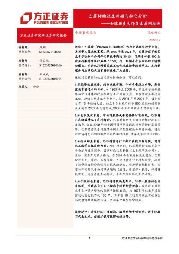 【方正证券】【20220807】全球投资大师复盘系列报告:巴菲特的收益回顾与持仓分析-25页