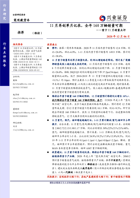 【兴业证券】【20201206】11月再创单月记录,全年160万辆销量可期——重卡11月销量点评-6页