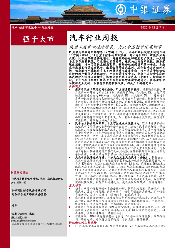 【中银证券】【20201207】汽车行业周报:乘用车及重卡延续增长,大众中国投资完成增资-18页