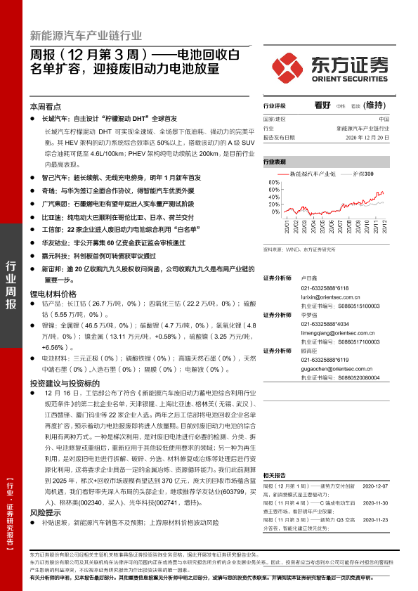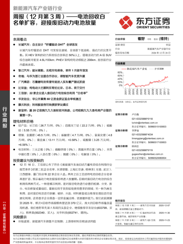 【东方证券】【20201220】20201220-东方证券-新能源汽车产业链行业周报(12月第3周):电池回收白名单扩容,迎接废旧动力电池放量-24页