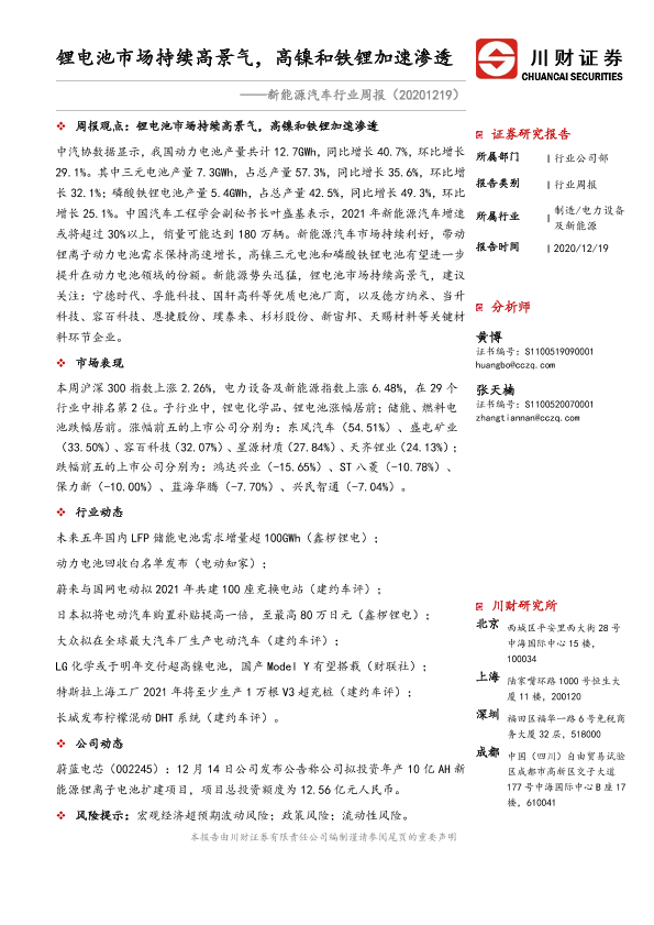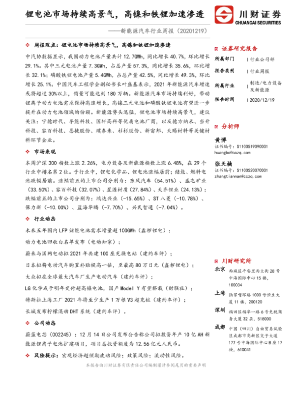 【川财证券】【20201219】新能源汽车行业周报:锂电池市场持续高景气,高镍和铁锂加速渗透-20页
