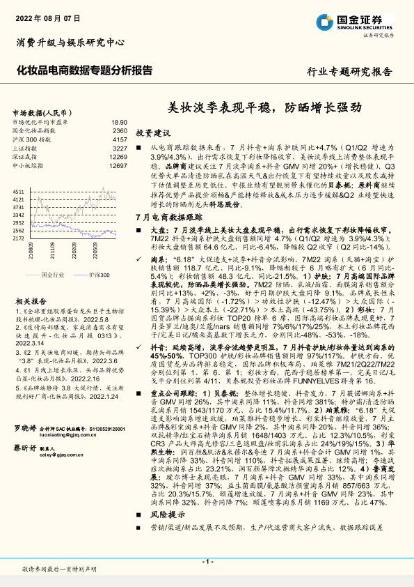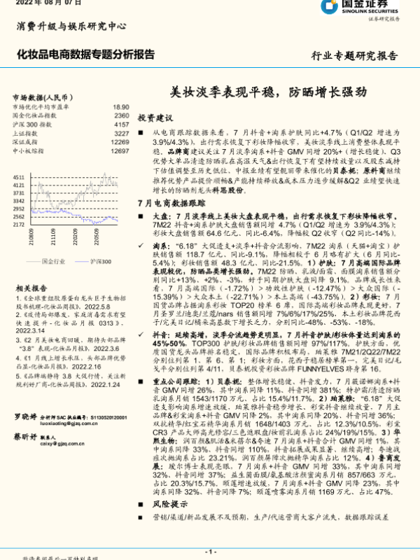 【国金证券】【20220807】化妆品电商行业数据专题分析报告:美妆淡季表现平稳,防晒增长强劲-19页