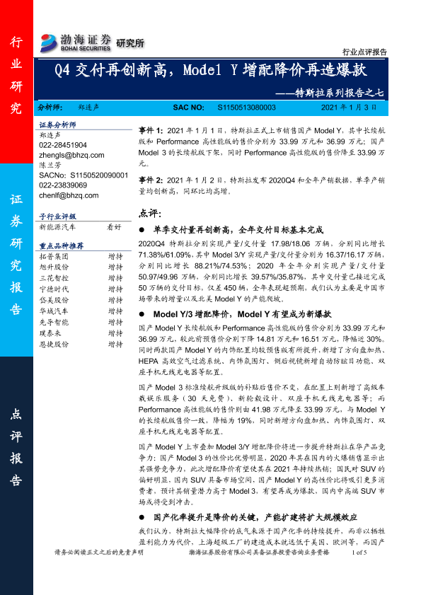 【渤海证券】【20210103】新能源汽车:特斯拉系列报告之七:Q4交付再创新高,Model Y增配降价再造爆款-5页