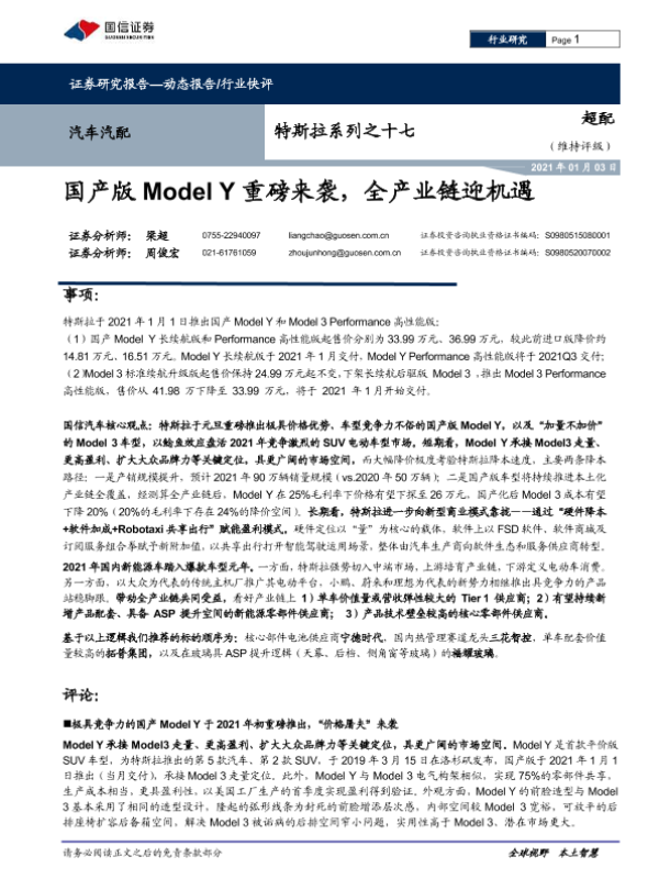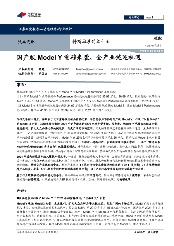 【国信证券】【20210103】汽车汽配行业:特斯拉系列之十七-国产版Model Y重磅来袭,全产业链迎机遇-13页