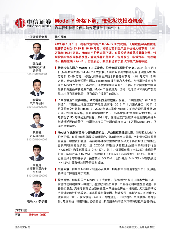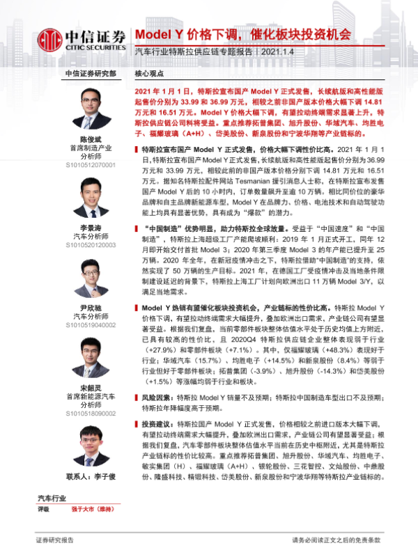 【中信证券】【20210104】汽车行业特斯拉供应链专题报告:Model Y价格下调,催化板块投资机会-10页