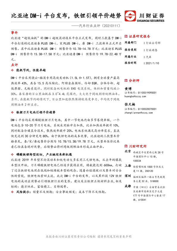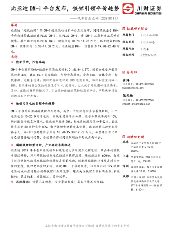 【川财证券】【20210110】汽车行业点评:比亚迪DM-i平台发布,铁锂引领平价趋势-2页