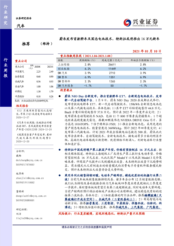 【兴业证券】【20210110】蔚来发布首款轿车及固态电池技术,特斯拉或将推出 16万元新车-24页