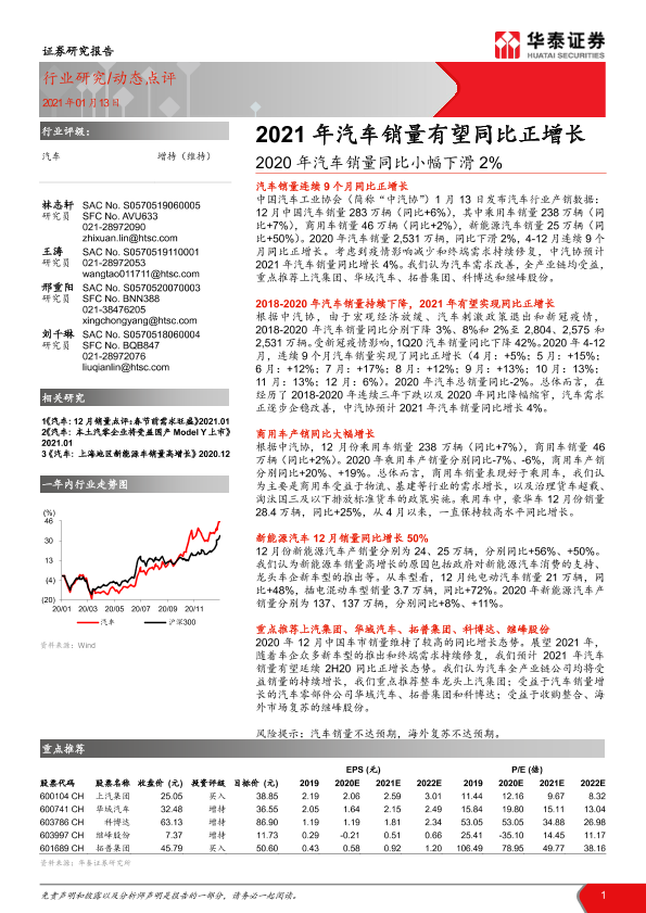 【华泰证券】【20210113】2020年汽车销量同比小幅下滑2%:2021年汽车销量有望同比正增长-6页