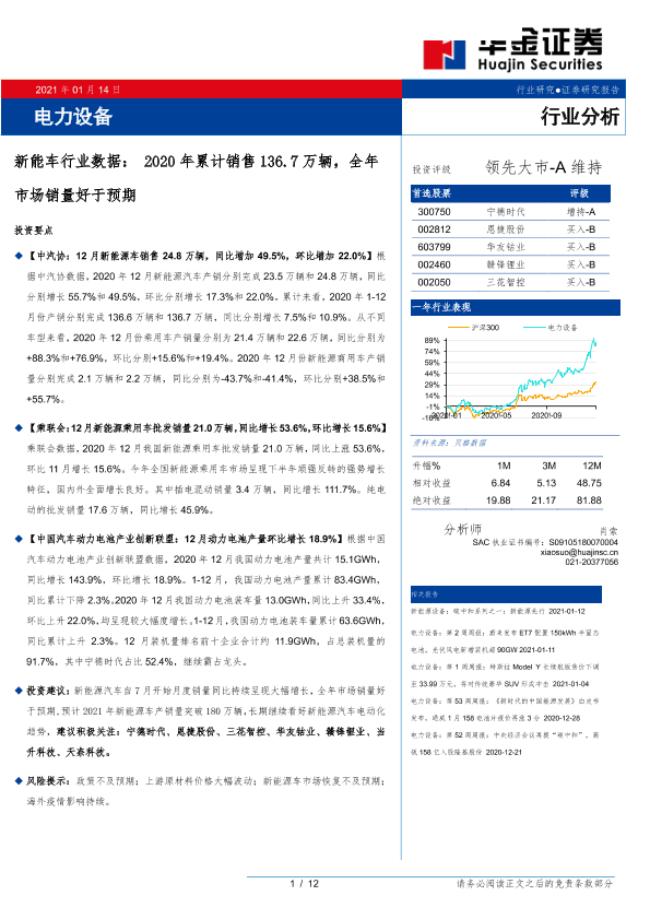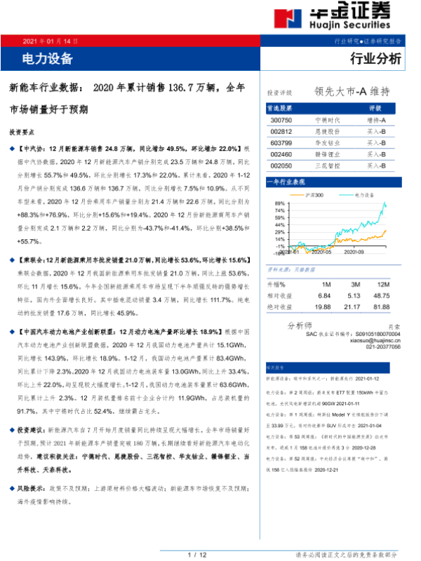 【华金证券】【20210114】新能车行业数据:2020年累计销售136.7万辆,全年市场销量好于预期-12页