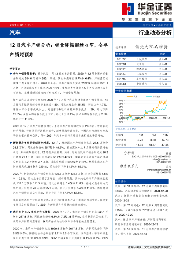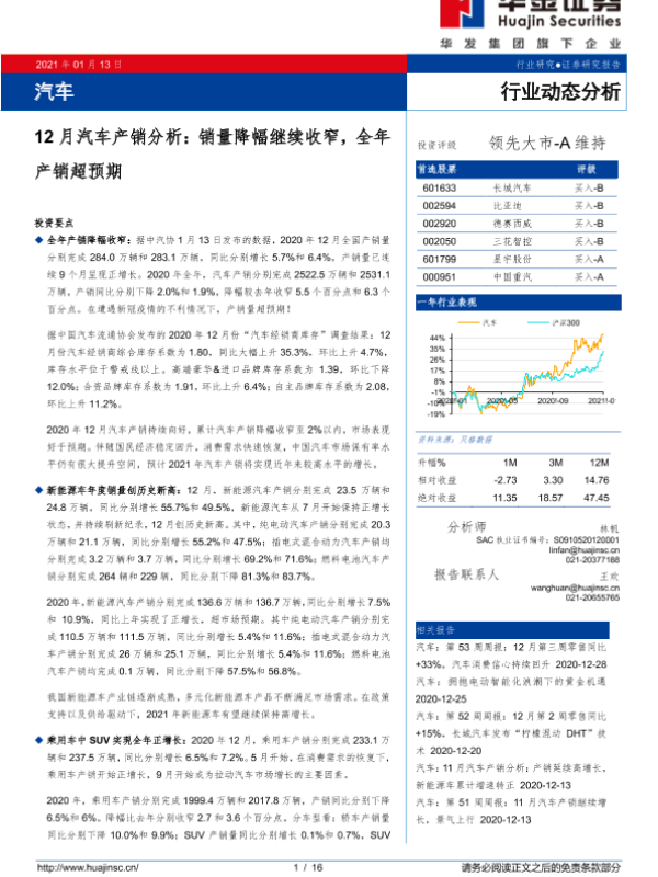 【华金证券】【20210113】12月汽车产销分析:销量降幅继续收窄,全年产销超预期-16页