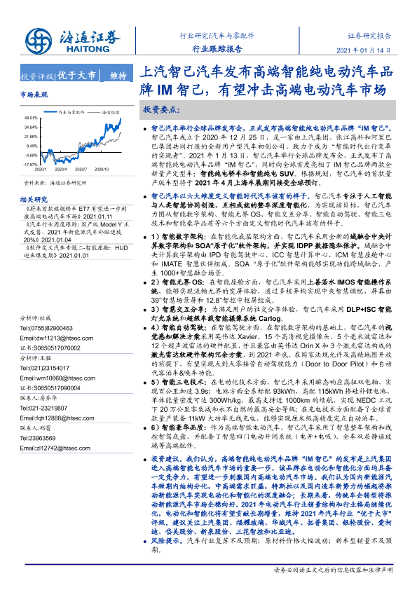 【海通证券】【20210114】汽车与零配件行业跟踪报告:上汽智己汽车发布高端智能纯电动汽车品牌IM智己,有望冲击高端电动汽车市场-4页