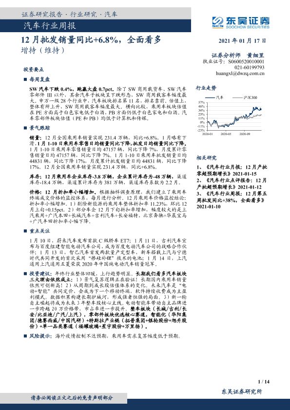 【东吴证券】【20210117】汽车行业周报:12月批发销量同比+6.8%,全面看多-14页