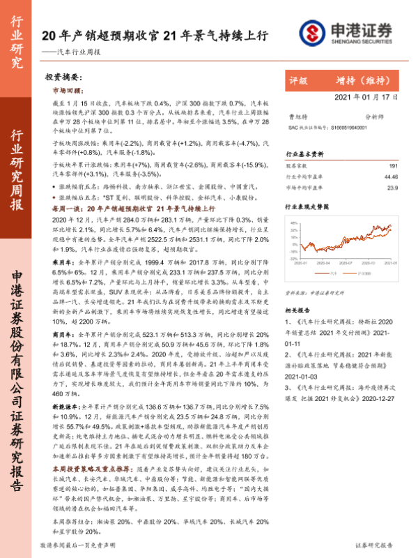 【申港证券】【20210117】20210117-申港证券-汽车行业周报:20年产销超预期收官,21年景气持续上行-15页