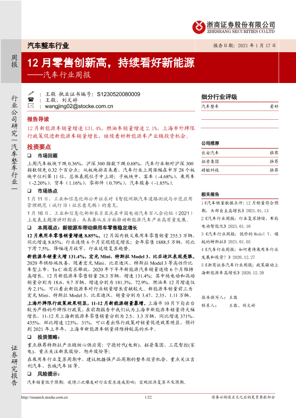 【浙商证券】【20210117】20210117-浙商证券-汽车行业周报:12月零售创新高,持续看好新能源-22页