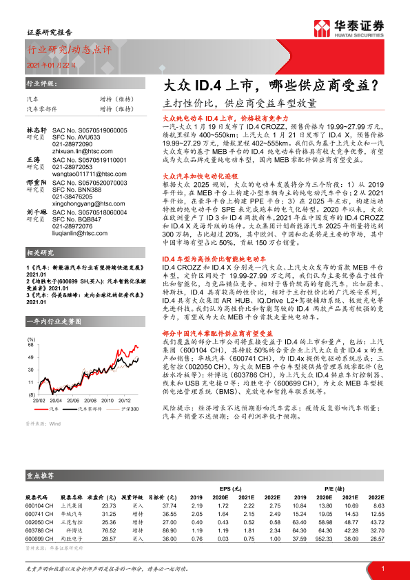 【华泰证券】【20210122】汽车行业:主打性价比,供应商受益车型放量:大众ID.4上市,哪些供应商受益?-6页