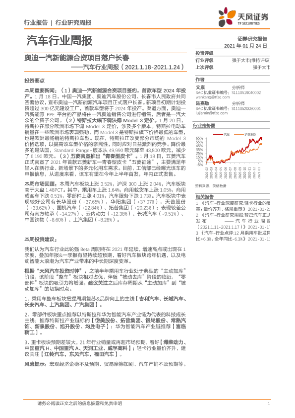 【天风证券】【20210124】20210124-天风证券-汽车行业周报:奥迪一汽新能源合资项目落户长春-13页