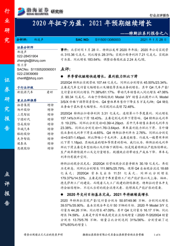 【渤海证券】【20210128】20210128-渤海证券-新能源汽车:特斯拉系列报告之八:2020年扭亏为盈,2021年预期继续增长-6页