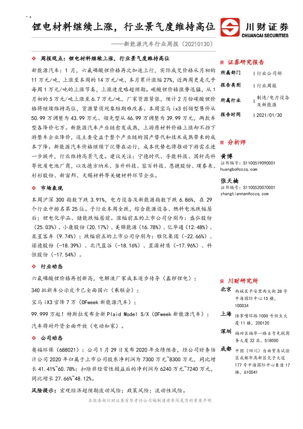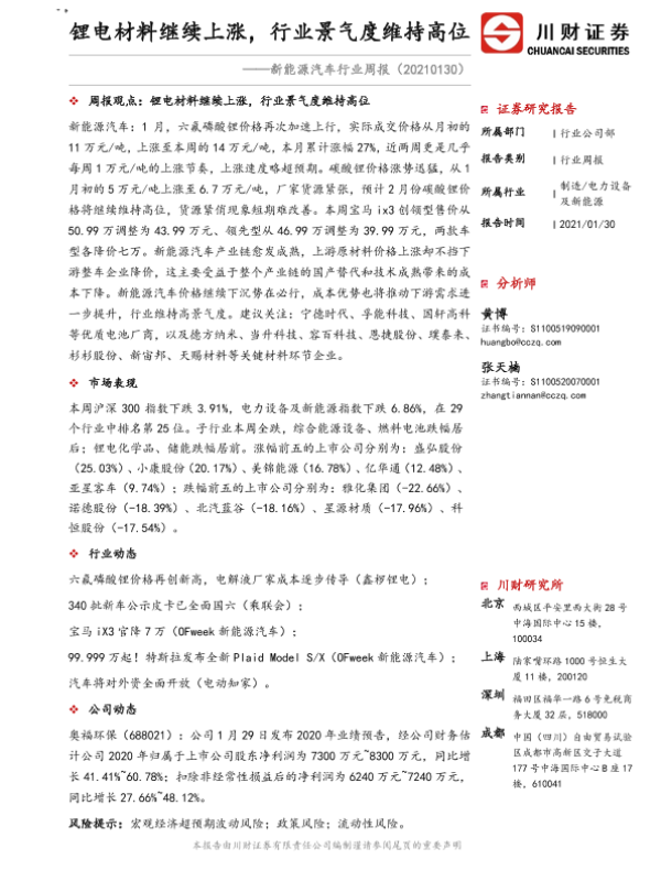 【川财证券】【20210130】20210130-川财证券-新能源汽车行业周报:锂电材料继续上涨,行业景气度维持高位-23页