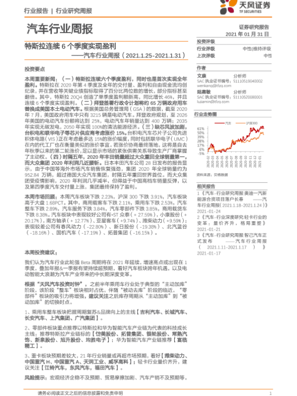 【天风证券】【20210131】汽车行业周报:特斯拉连续6个季度实现盈利-13页