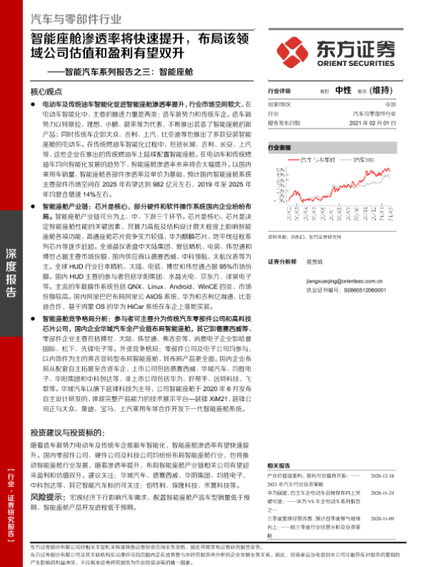 【东方证券】【20210201】汽车与零部件行业智能汽车系列报告之三:智能座舱-智能座舱渗透率将快速提升,布局该领域公司估值和盈利有望双升-28页