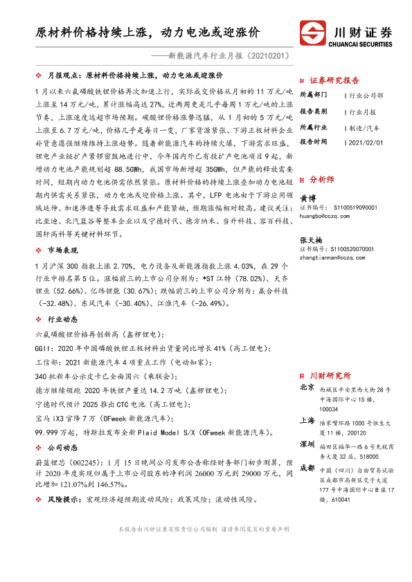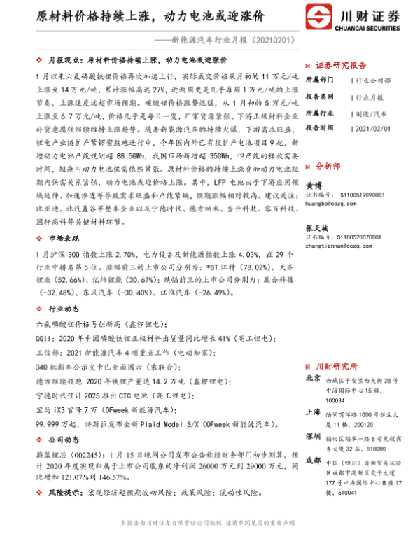 【川财证券】【20210201】新能源汽车行业月报:原材料价格持续上涨,动力电池或迎涨价-25页