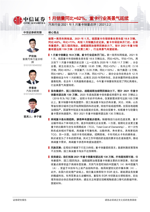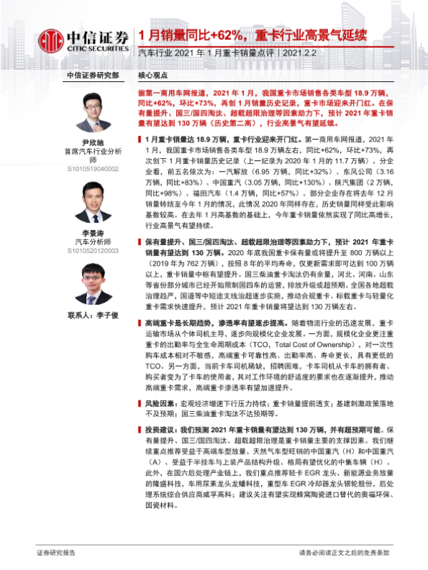 【中信证券】【20210202】汽车行业2021年1月重卡销量点评:1月销量同比+62%,重卡行业高景气延续-4页