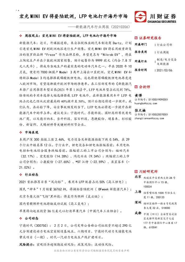 【川财证券】【20210206】20210206-川财证券-新能源汽车行业周报:宏光MINI EV将登陆欧洲,LFP电池打开海外市场-18页