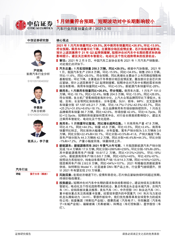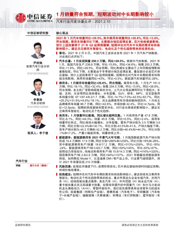 【中信证券】【20210210】20210210-中信证券-汽车行业月度销量点评:1月销量符合预期,短期波动对中长期影响较小-2页