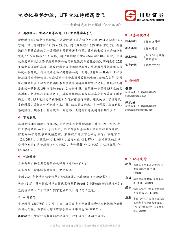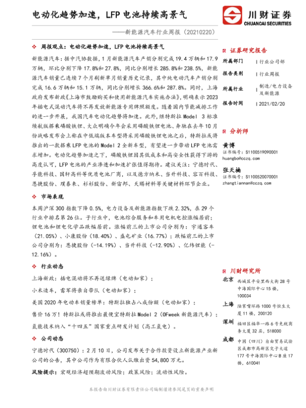 【川财证券】【20210220】新能源汽车行业周报:电动化趋势加速,LFP电池持续高景气-19页