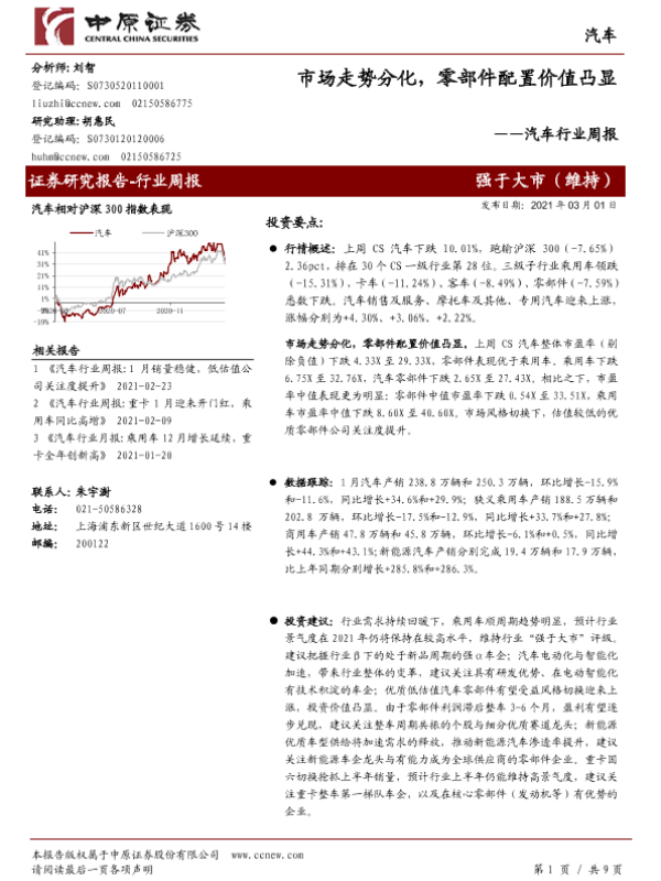 【中原证券】【20210301】市场走势分化,零部件配置价值凸显——汽车行业周报-9页