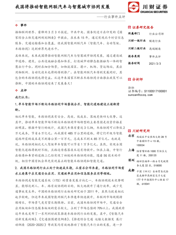 【川财证券】【20210303】汽车行业事件点评:我国将推动智能网联汽车与智慧城市协同发展-3页