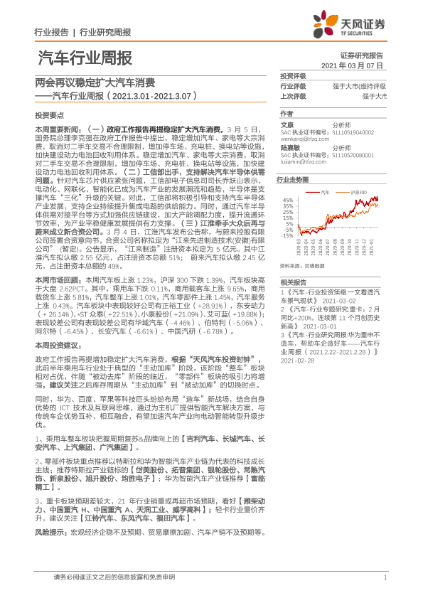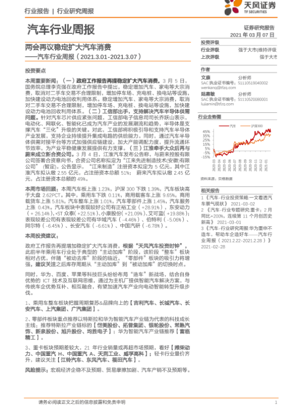 【天风证券】【20210307】汽车行业周报:两会再议稳定扩大汽车消费-15页